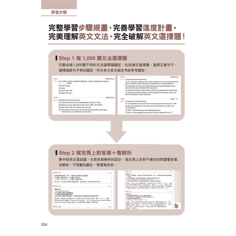 獨創「左頁考題」+「右頁詳解」,寫完馬上對答案,瞬間矯正錯誤觀念。過往模擬試題,還需要翻來翻去對答案,這樣節省下來的時間,就拿去複習文法觀念加深印象。學習高效率、考試就能有高通過率。