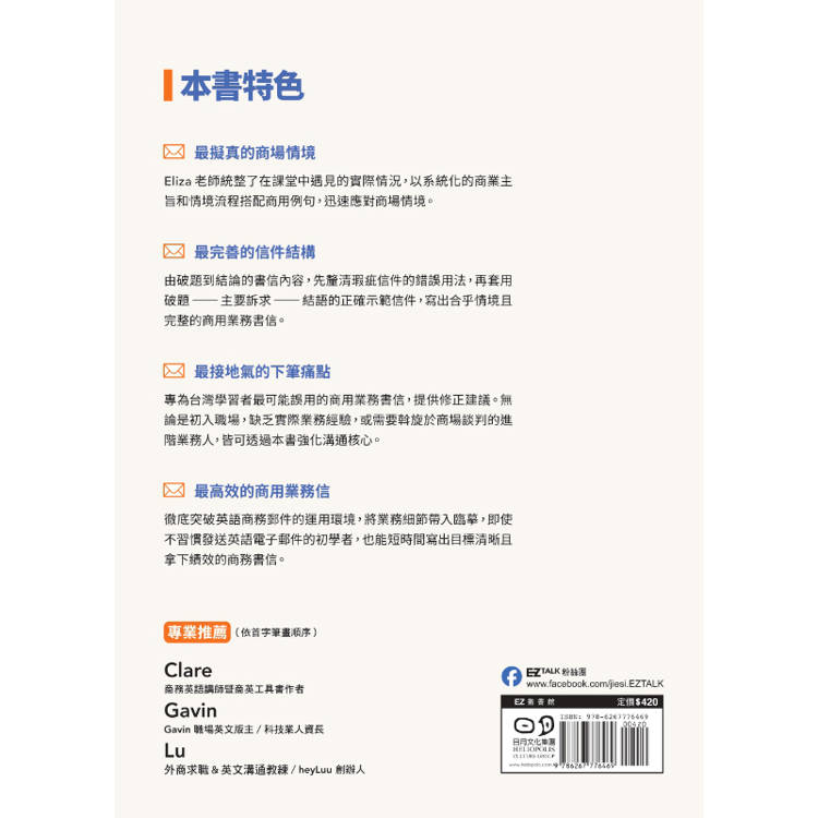 Eliza老師統整了在課堂中遇見的實際情況,包含學生或社會人士在學習中容易犯錯或感到困惑的地方,以系統化的商業主旨和情境流程搭配商用例句,強化商務溝通上需特別留意的用語,迅速應對於商場情境。
