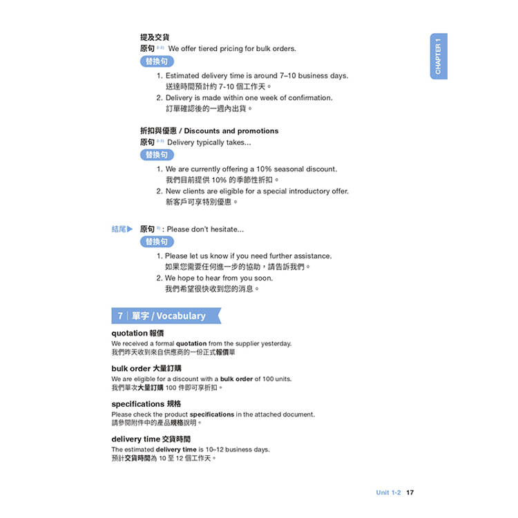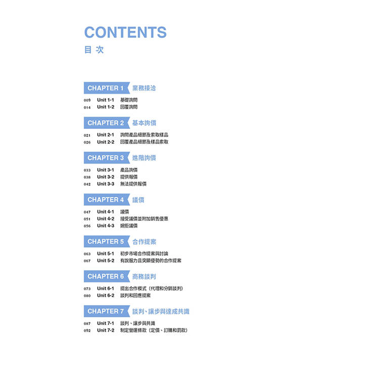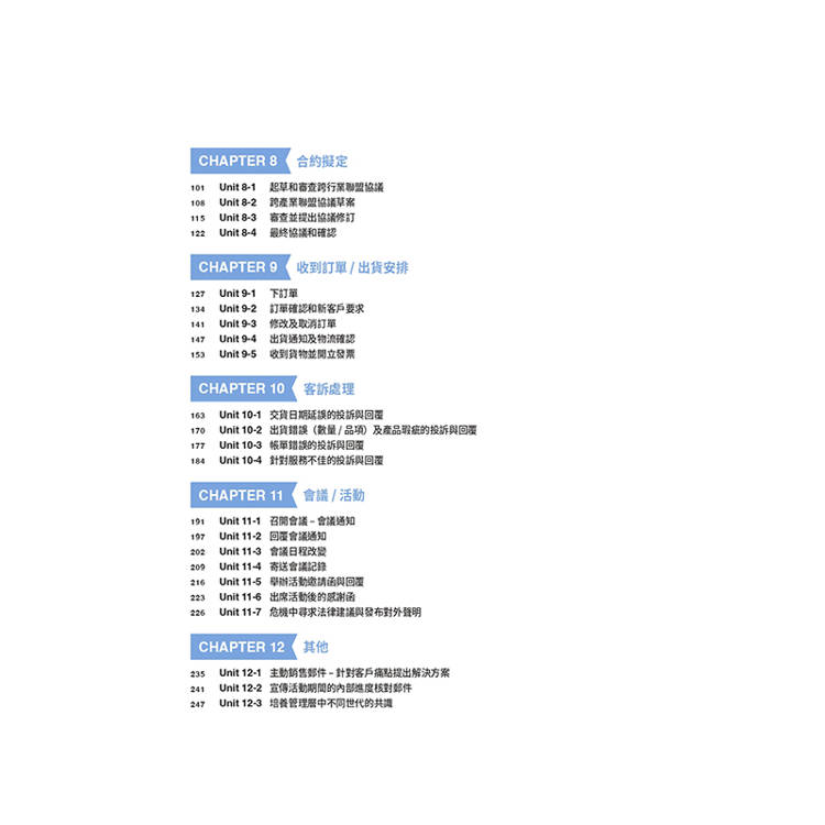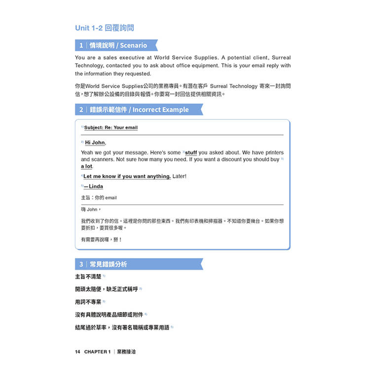 針對台灣學習者最可能發生錯誤的商用業務書信領域,提供修正建議。無論是初出茅廬的職場新鮮人,踏入商場多年卻缺乏實際業務經驗,或是需要剛柔並濟進入商場談判的進階老手,皆可透過本書強化溝通核心。