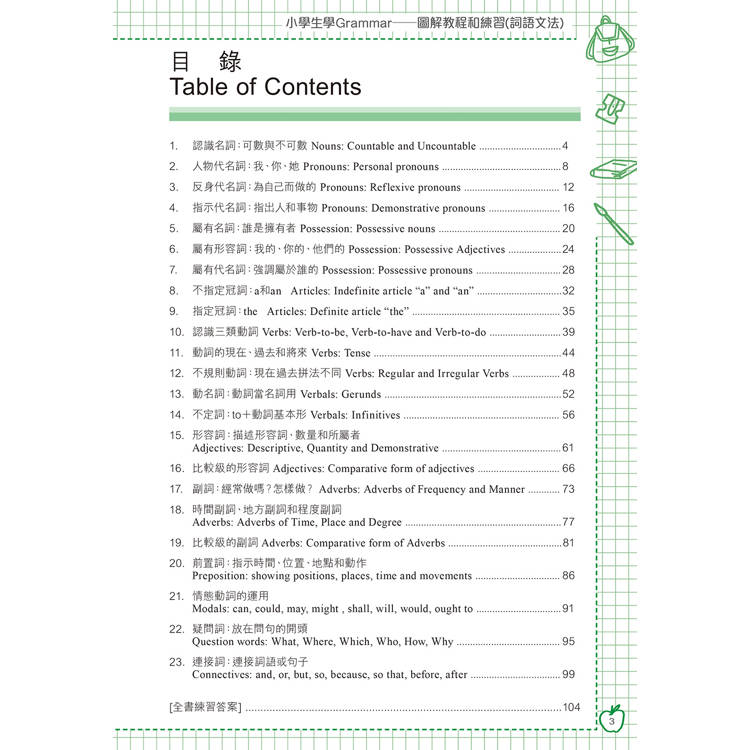 書中共有23篇以圖解方式教授的英文詞語文法教程,有趣、易學、易明,已覆蓋小學階段要達到的絕大部分學習目標,並本 書 69組應用練習,配合每篇教程,分為較淺的文法加油站和較深的挑戰站,以供不同程度的學生隨時以實習提升水平,為學習英文打好全面堅實的基礎。