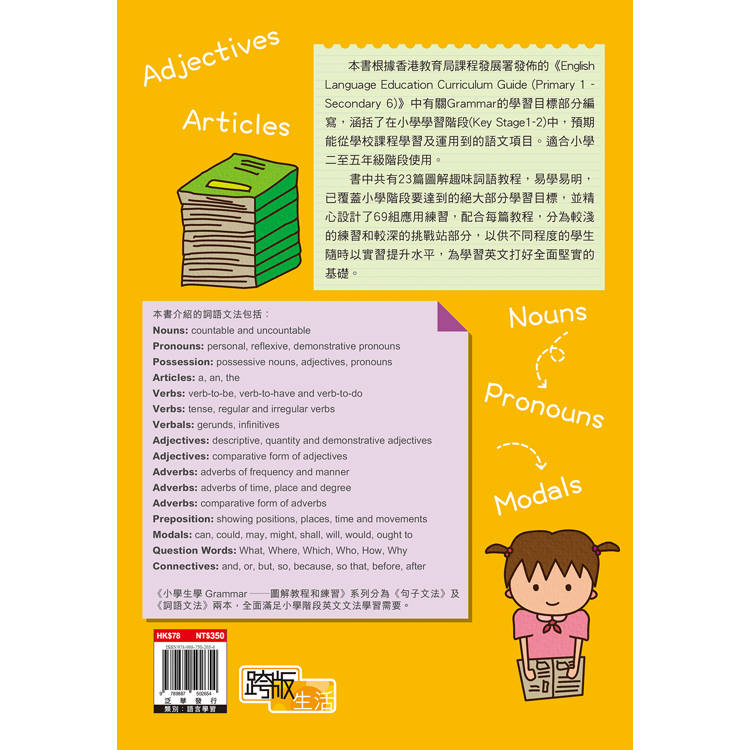 本書根據香港教育局課程發展署發佈的English Language Education《Curriculum Guide (Primary 1 - Secondary 6)》中有關Grammar的學習目標部分編寫,涵括了在小學學習階段(Key Stage1-2)中,預期能從學校課程學習及運用到的語文項目。適合小學二至五年級階段使用。