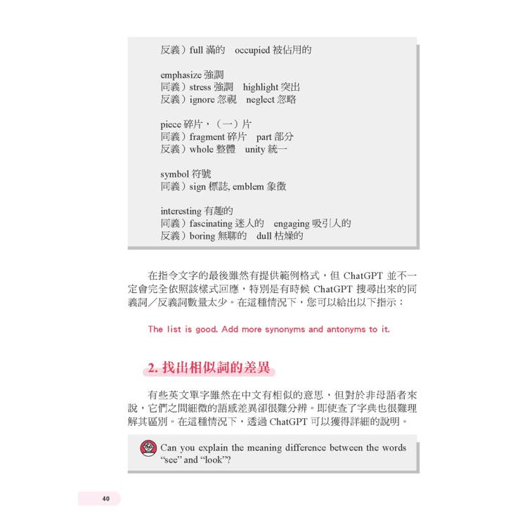 附上精準的指令範例,但不僅只是列出來而已,還逐步解說,讓你除了可簡單複製貼上之外,還可依個人需求隨意修改、套用替換、靈活運用,寫出能得到滿意回應的精準指令。