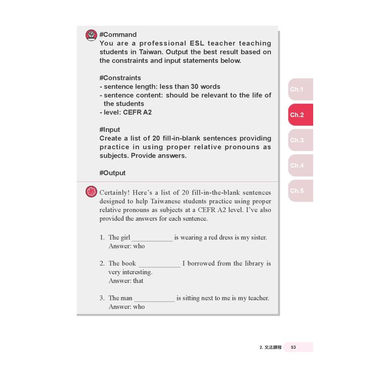 市面上許多關於ChatGPT的書籍,大多是針對任何年齡層、任何身分的指令說明書,鮮少是專為第一線教育者規劃、並針對英語教學方面的領域,而本書正是一本針對教學方面讓各位老師學會善用ChatGPT的寶典,從此能夠快速製作課堂教材、整理單字表、講解英文文法、撰寫例句等英語教學大小事。