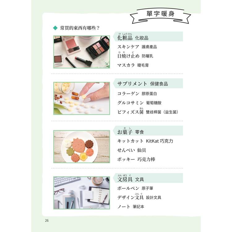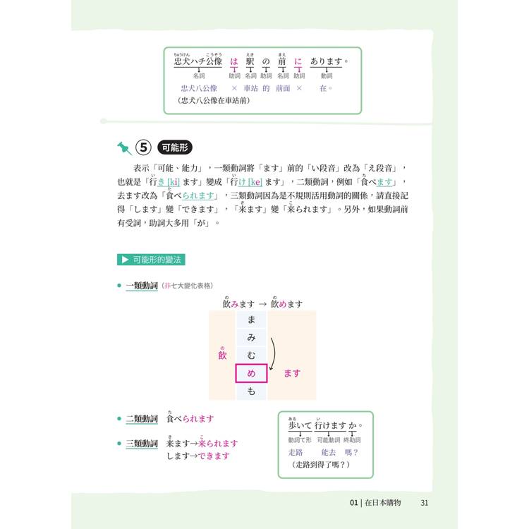除了文法知識之外,本書所有章節都會有日本的文化與景點的介紹,不只是為了長知識,了解日本的風俗文化在和日本人交流、在日本觀光時都是很重要的!
