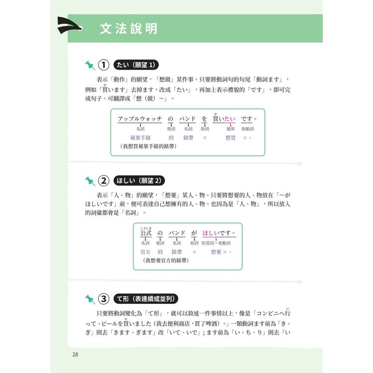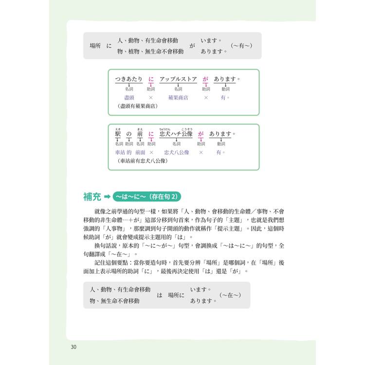 文法說明也很詳細,將例句分解開來,「(名詞+助詞+名詞+助動詞)、(名詞+助詞+動詞)…」,國語母語者所不熟悉的日語膠著語結構,讓你輕鬆破解,一眼就看懂日語的原理,看完沒多久就能自己造句;文法複習的頁面將插圖融入例句,可以自行在腦中聯想替換句,能快速熟悉文法。