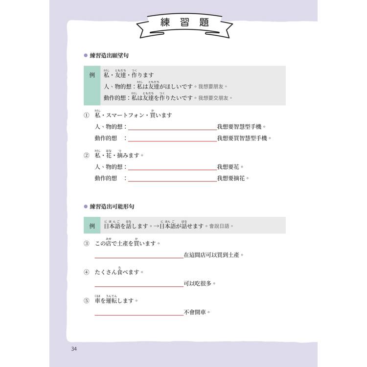 每單元之後都會附上一些「立即實用」的練習題,主要包括看圖或例句來造句或是連連看正確答案,學完文法馬上套用,加深記憶、不再只是紙上談兵。還有由資深日語教師專門為此書設計的日語課堂活動,能和同學或朋友互動練習,把書本上的知識轉化為實際對話。不論是自學還是課堂使用,都能真正體會「學了就能開口說」的成就感。