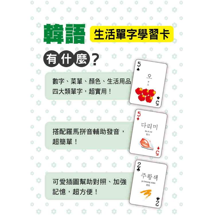 打開撲克牌玩一玩!每張撲克牌都有韓語、中文解釋,搭配羅馬拼音輔助發音,只要跟著讀、照著唸,韓語一點都不難!
