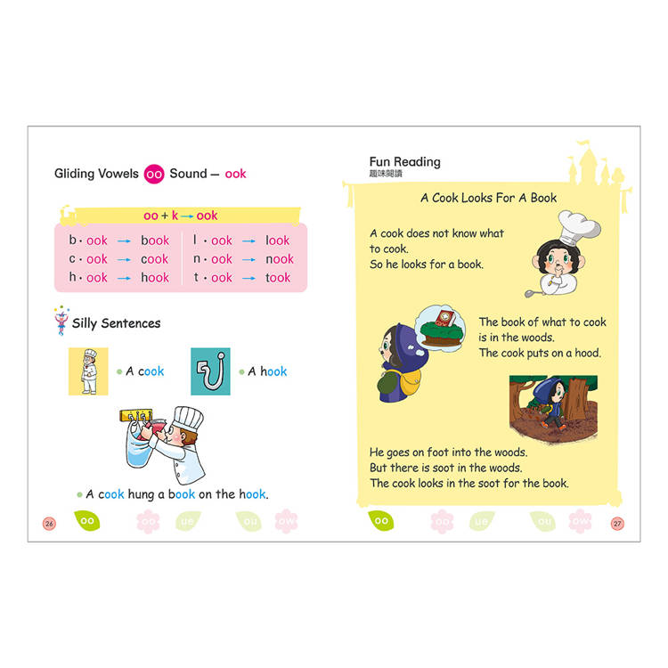 自然發音拼讀系列的第四、五、六冊,延續長母音教學主軸,本套組涵蓋了Long Vowel Digraphs (複合長母音)、Gliding Vowels ( 雙母音)、R-Controlled Vowels (R 控制的母音)。再次強調了學習自然發音法的目的,並學習字母之間的對應關係。