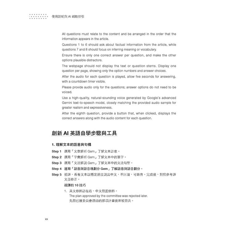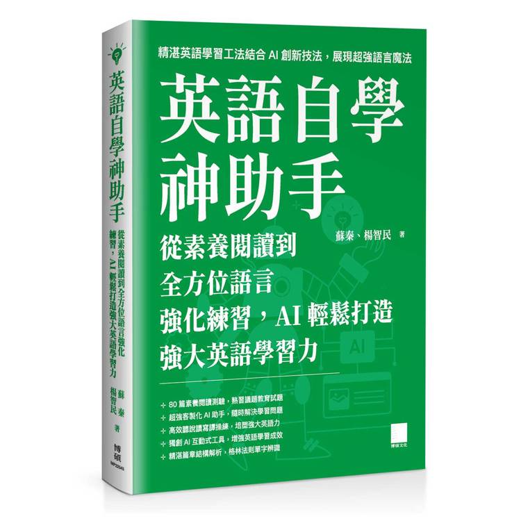 「兩位作者整合聽說讀寫譯,示範如何正確、有效地運用 AI,藉此希冀讀者能逐步累積,建立有效的英語自學模式。」