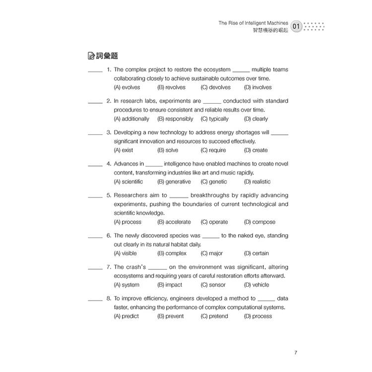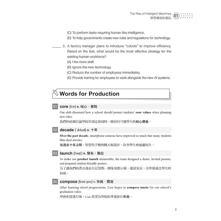 全書收錄 40 篇 CEFR B1 等級的素養閱讀文本,依「科學科技、社會永續、藝術人文、經濟創新」四大主題編排,兼顧議題深度與語言可及性。為深化讀者對文章脈絡的掌握,我們特別在雲端提供詳盡的篇章結構理論導讀,協助讀者學會辨識主題句、論點展開與結論功能,不僅能以此破解篇章結構考題,更能將此邏輯應用於寫作產出;書中亦透過80 篇素養導向閱讀測驗,引導讀者熟悉議題式命題邏輯,掌握重要考試的出題趨勢。