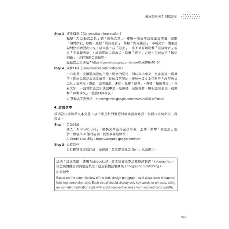 在技能整合上,書中系統性串聯聽、說、讀、寫與翻譯操練:透過 NotebookLM 將篇章結構與重點視覺化,協助建立整體理解;運用 AI Studio Live 與 CoolEnglish 進行 TTS 發音校正、有稿與無稿跟讀(shadowing)、循序口譯訓練;並結合結構導向寫作回饋,讓輸出能回扣閱讀時所建立的篇章意識。這些設計並非零散技巧的拼湊,而是以語言學理為主軸,讓各項能力自然銜接、相互支撐。