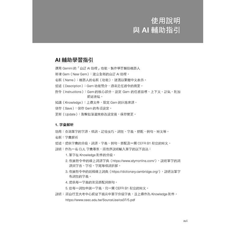 本書的核心特色,在於「高度客製化的 AI 學習助手」與一系列獨創的互動式學習工具。我們引導讀者運用 Gemini 的「自訂 AI 助理(Gems)」,打造專屬於自己的語言學習機器人。其功能不僅涵蓋字彙解析與文法說明,更特別強化格林法則單字辨識、字族擴展、常見搭配分析,以及長難句與篇章結構的分層拆解,讓 AI 真正成為理解過程的引導者,而非單純給出結果的替代者。