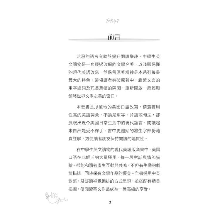 在寰宇文學的現代美語版套書中,美國口語在此鮮活的大量運用。每一段對話與情節描繪,都能和讀者產生互動與共鳴,不但有生動的劇情描述,同時保有文學作品的優美。