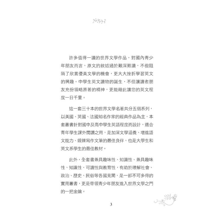 這一套三十本的世界文學名著,共分五個系列,以美國、英國、法國知名作家的經典作品為主,本套叢書針對國中及高中學生英語程度而設計,適合青年學生課外閱讀之用,是加深文學涵養、增進語文能力、鍛鍊寫作文筆的最佳良伴,也是大學生和外文系的最佳教材。