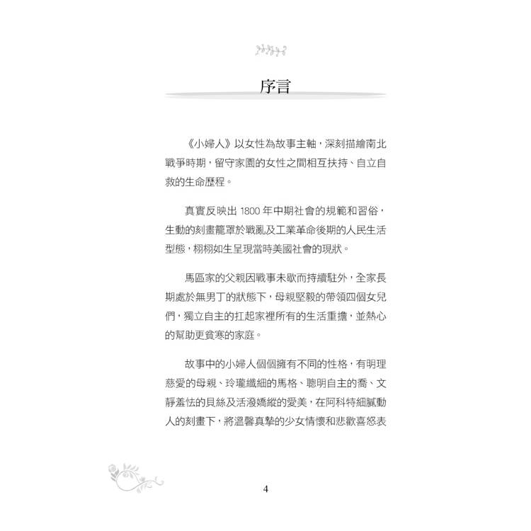 故事中的小婦人個個擁有不同的性格,有明理慈愛的母親、玲瓏纖細的馬格、聰明自主的喬、文靜羞怯的貝絲及活潑嬌縱的愛美,在阿科特細膩動人的刻畫下,將溫馨真摯的少女情懷和悲歡喜怒表現得淋漓盡致。