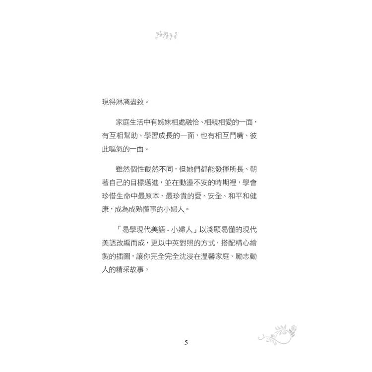 「易學現代美語- 小婦人」以淺顯易懂的現代美語改編而成,更以中英對照的方式,搭配精心繪製的插圖,讓你完全完全沈浸在溫馨家庭、勵志動人的精采故事。