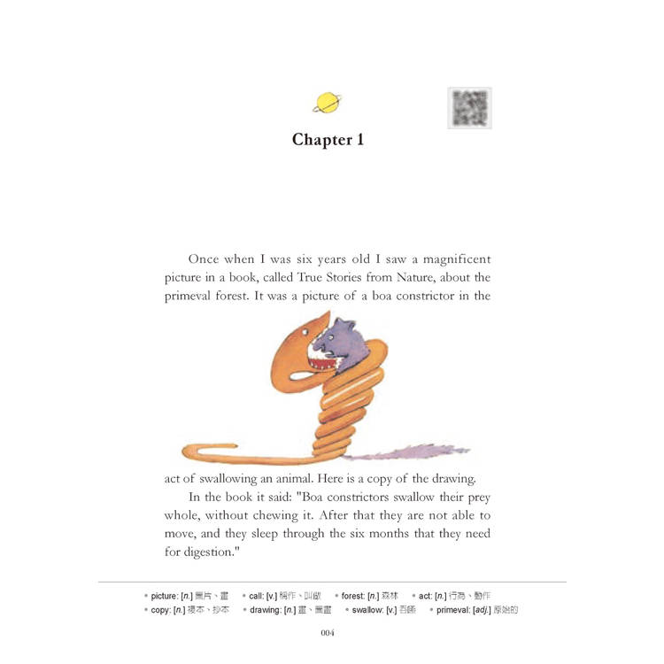 ● picture [n.] 圖片、畫 ● call [v.] 稱作、叫做 ● forest [n.] 森林 ● act [n.] 行為、動作 ● copy [n.] 複本、抄本 ● drawing [n.] 畫、圖畫 ● swallow [v.] 吞嚥 ● primeval[adj.]原始的