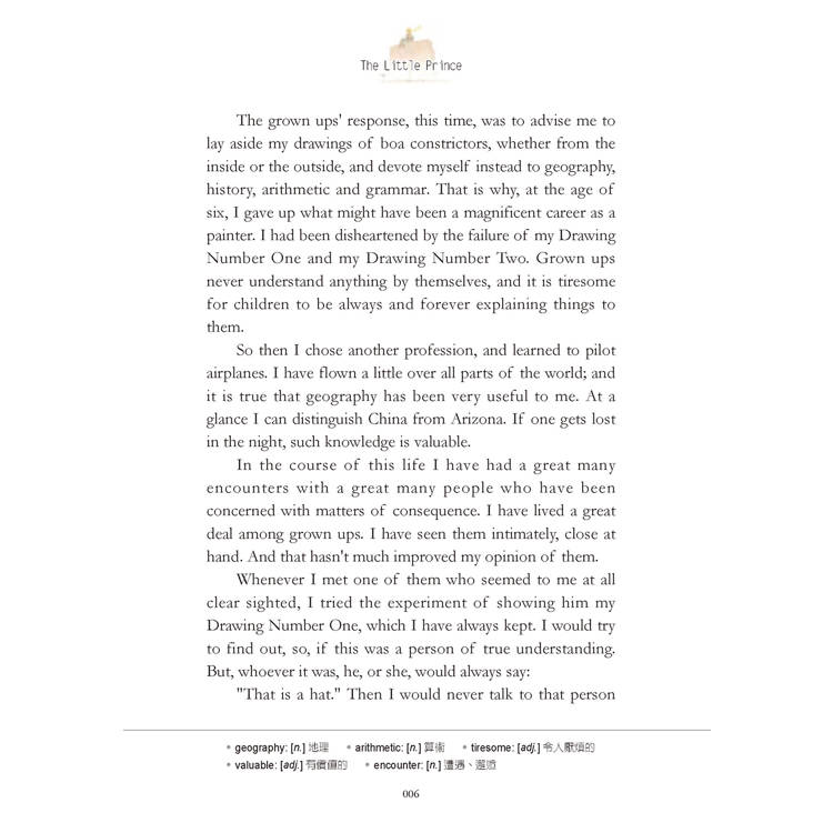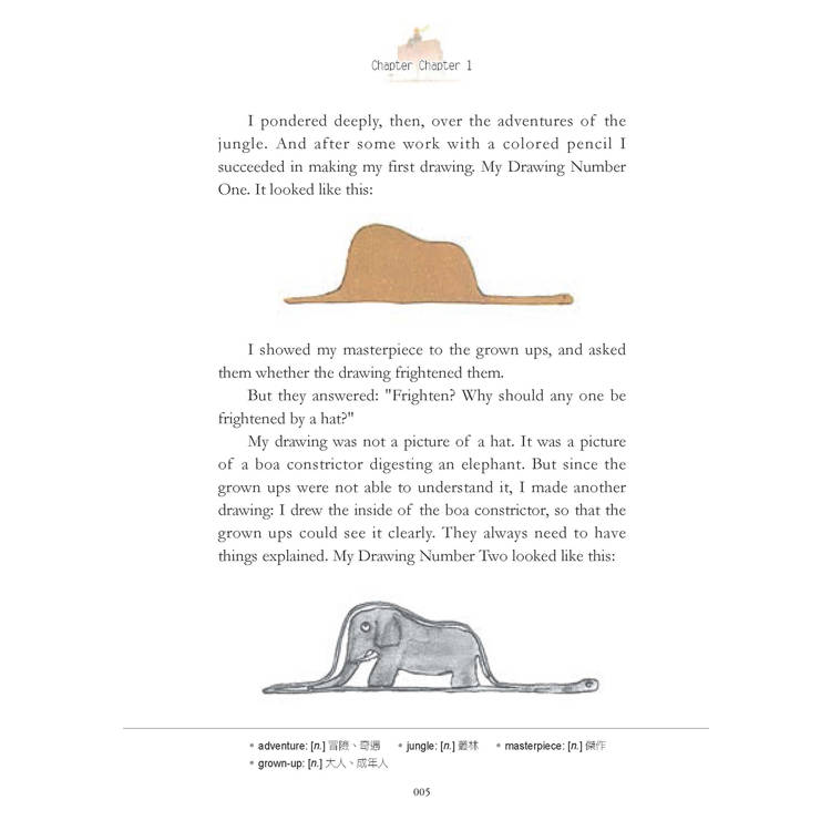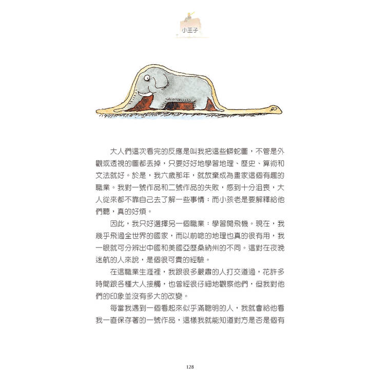 每當我遇到一個看起來似乎滿聰明的人,我就會給他看我那一直保存著的一號作品,這樣我就能知道對方是否是個有理解力的人。然而,這些大人都說:「這是一頂帽子。」於是,我就不會再跟他解釋什麼蟒蛇、原始雨林,或星星了。我會遷就他們,談談橋牌、高爾夫球、政治,還有領帶等等的話題。這樣一來,這些大人就會非常高興他們遇到一個無所不談的人。