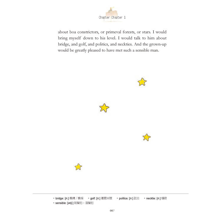 我目瞪口呆地站著,看著這個突然出現,如幻影般的人。別忘了,我現在迫降在這個方圓百里渺無人跡的沙漠。而眼前這個小人兒既不像是在沙漠裡迷路;也不像疲憊、飢餓、口渴或害怕的人,況且從他的身上一點兒都看不出他正迷失在這個沙漠。當我終於回神說得出話來時,我問他:「你在這兒做什麼?」