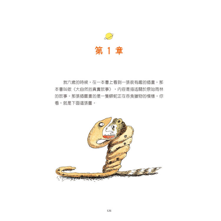 1 我六歲的時候,在一本書上看到一張很有趣的插畫,那本書叫做《大自然的真實故事》,內容是描述關於原始雨林的故事。那張插圖畫的是一隻蟒蛇正在吞食獵物的模樣。你看,就是下面這張圖。