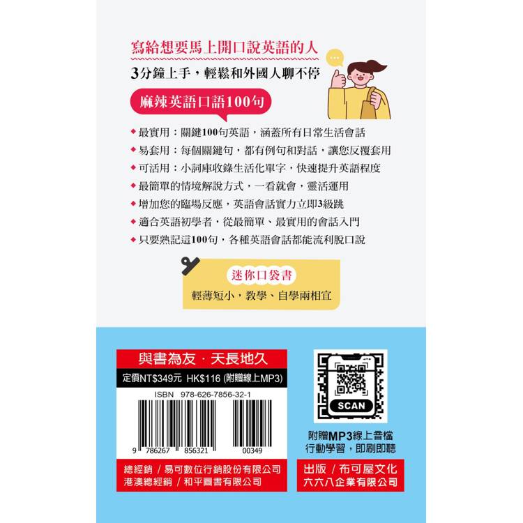 本書收集老外最常用的生活會話和口頭用語,句句都是每天用得到の英語,簡單易學,3 分鐘上手,初學英語輕鬆開口說,無師也能自通。迷你口袋書,輕薄短小,教學、自學兩相宜。