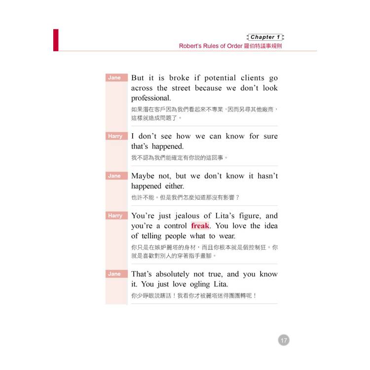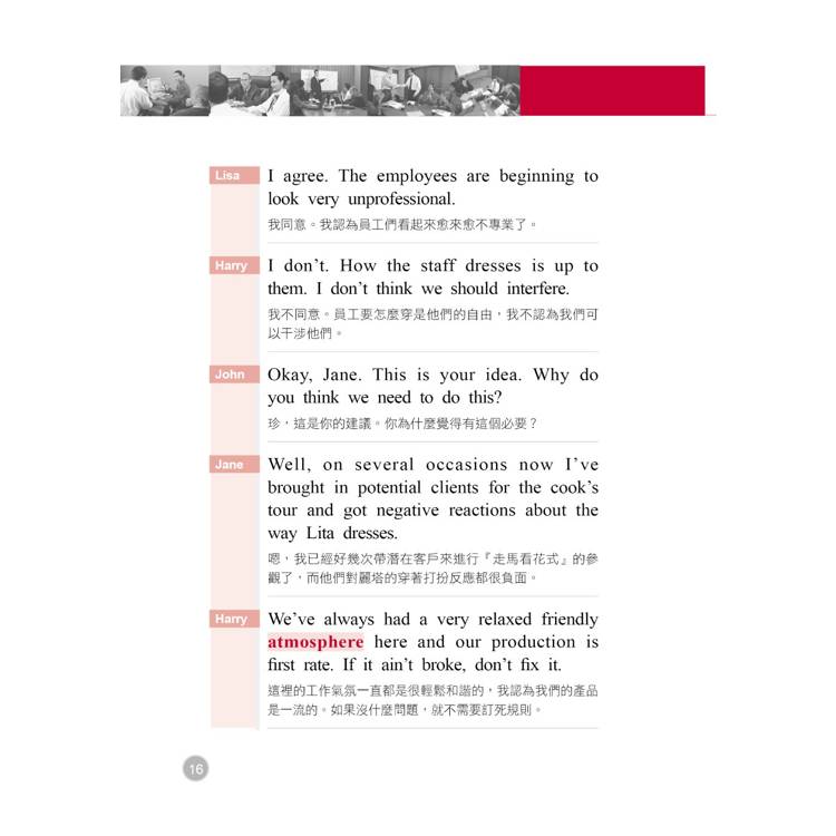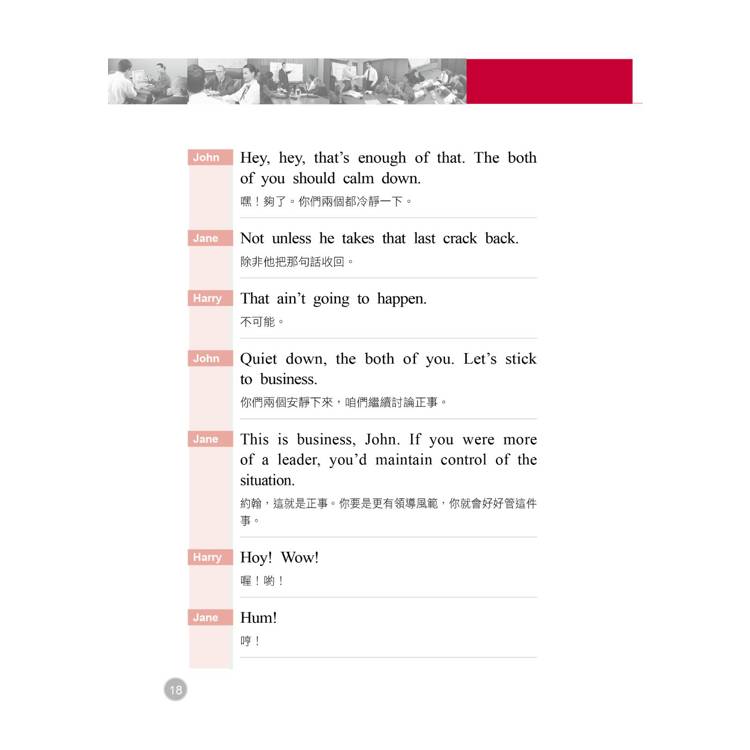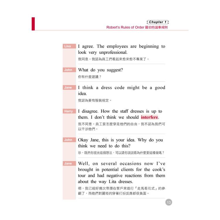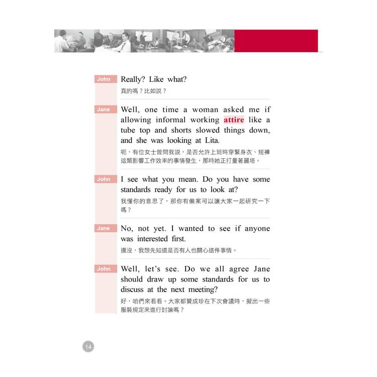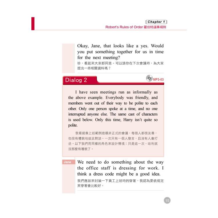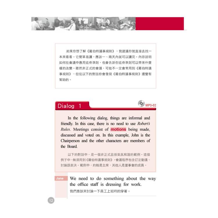 二、 Dialog 範例對話:為了方便讀者的全面吸收,本書特別將主要單字用套色標出,方便您記憶。同樣地,為了體貼生活分秒必爭的讀者們,對話部分也附上精準的中文譯解,快速促進您對會議用語、常見問答的熟悉度。