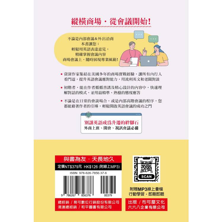 尤其在正式場合中,與重要人士開會,如何用字遣詞,暢快表達,更顯重要,本書讓您能用道地的英語行話洽談,首次應對,便讓對方留下專業印象,並為自己及所屬公司謀取更多福利,順利達成商談任務。