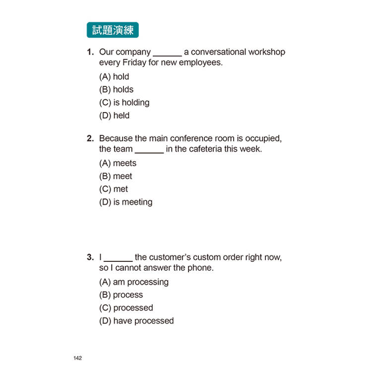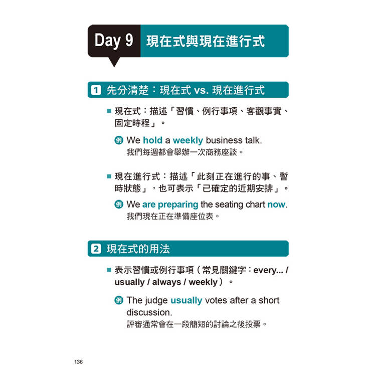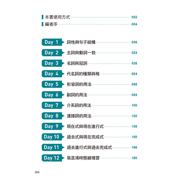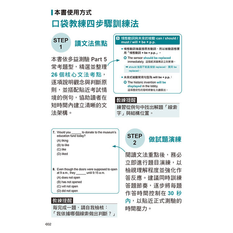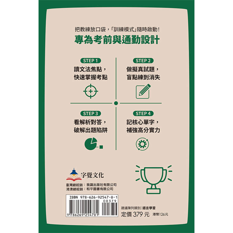 在本書中,教練為你安排26天的訓練:每天一個小回合,短但扎實,適合放進忙碌生活的空檔,也足以在考前累積出可靠的反應速度。每個單元建議依序完成四個步驟:先讀「文法焦點」,把必考觀念與判斷規則弄清楚;再做「試題演練」,練習對應的答題技巧,並找出自己最常卡住的地方;接著對照左右頁的「考點解析」,逐題釐清「為何對、為何錯」,把出題套路記牢、把錯因修正到位;最後整理「核心單字」,補強常考用字與搭配,讓自己讀題更順暢、判題更快速。