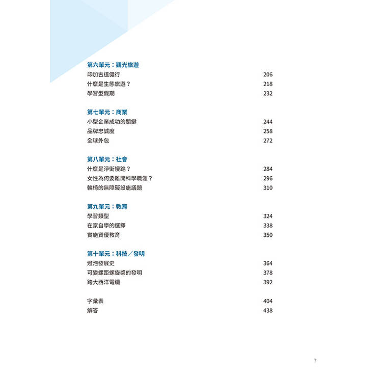 十大核心主題: 涵蓋自然世界、休閒時間、交通運輸、文化、健康、觀光旅遊、商業、社會、教育、科技/發明十個必考領域。