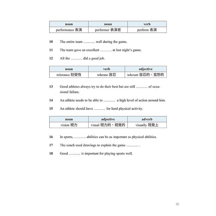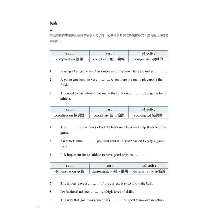 在學習設計上,本書並未採取傳統「先給字表再閱讀」的方式,而是引導考生先透過字義配對等任務檢核既有知識,並鼓勵他們在閱讀過程中運用列舉、定義與對比等脈絡提示推敲字義。這樣的安排讓閱讀不再因查字典而中斷,也讓單字的意義與使用情境直接連結起來。此外,詞族練習則幫助考生理解單字在不同詞性下的功能與字形變化,並觀察詞性與句構之間的互動關係,為改述與輸出奠定基礎。