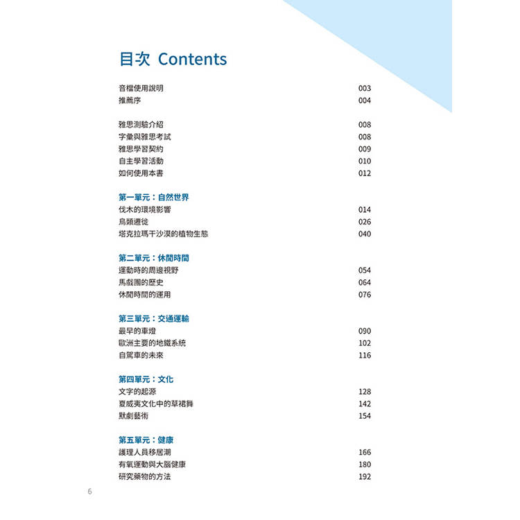以「自然世界」單元為例,讀者不僅會學到array、habitat、fell、terrestrial、aquatic、myriad、intact、erosion、inhibit、inhabit、imperative、breed、hemisphere、species、endure、aspect、nocturnal、diurnal、stray、sparse、fringe、resilient、prolific、evaporation、dilute、accumulate等學術詞彙,同時每個單元都提供與主題相關的閱讀理解(含 TRUE / FALSE / NOT GIVEN 題型)、寫作 Task 1(含圖表寫作)與 Task 2(議論文與說明文)、聽力(含 Writing ONE WORD ONLY for each answer題型),及口說測驗(含Part 3 Discussion topics題型)的模擬試題,進而全面強化四大技能的應試能力。