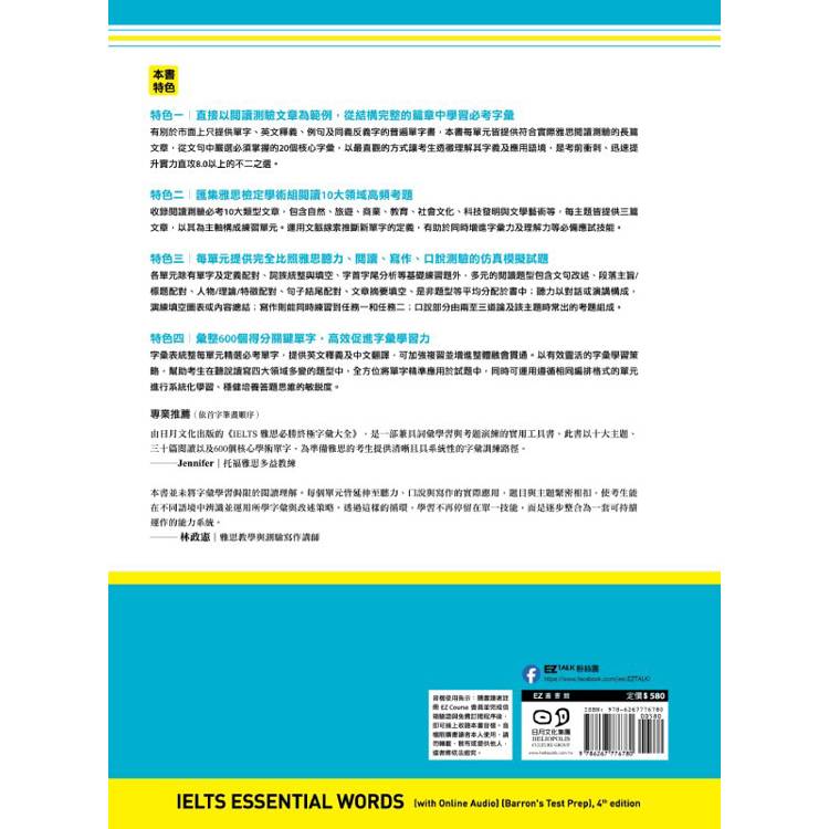 有別於市面上只提供單字、英文釋義、例句及同義反義字的普遍單字書,本書每單元皆提供符合實際雅思閱讀測驗的長篇文章,從文句中嚴選必須掌握的20個核心字彙,以最直觀的方式讓考生透徹理解其字義及應用語境,是考前衝刺、迅速提升實力直攻8.0以上的不二之選。