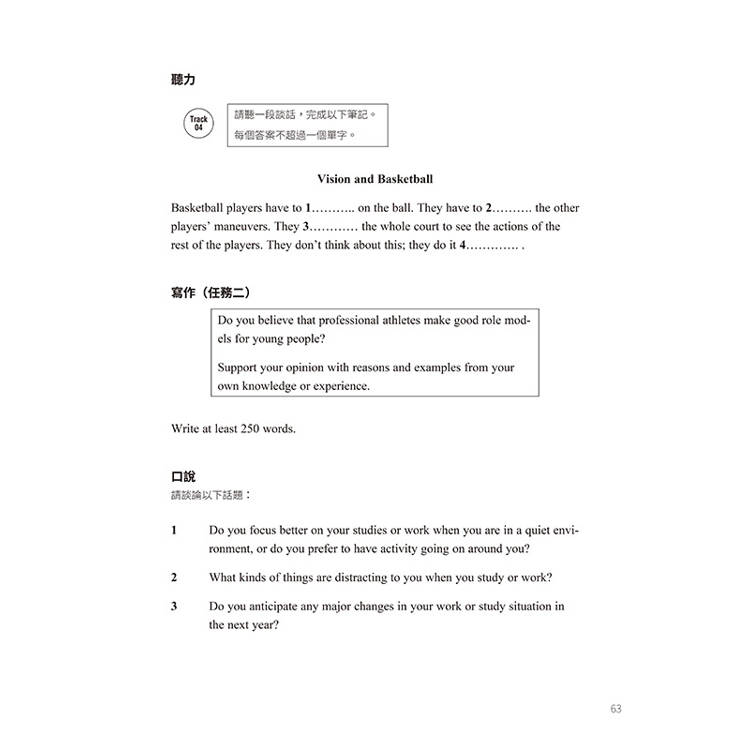 各單元除有單字及定義配對、詞族統整與填空、字首字尾分析等基礎練習題外,多元的閱讀題型包含文句改述、段落主旨/標題配對、人物/理論/特徵配對、句子結尾配對、文章摘要填空、是非題型等平均分配於書中;聽力以對話或演講構成,演練填空圖表或內容總結;寫作則能同時練習到任務一和任務二;口說部分由兩至三道論及該主題時常出的考題組成。