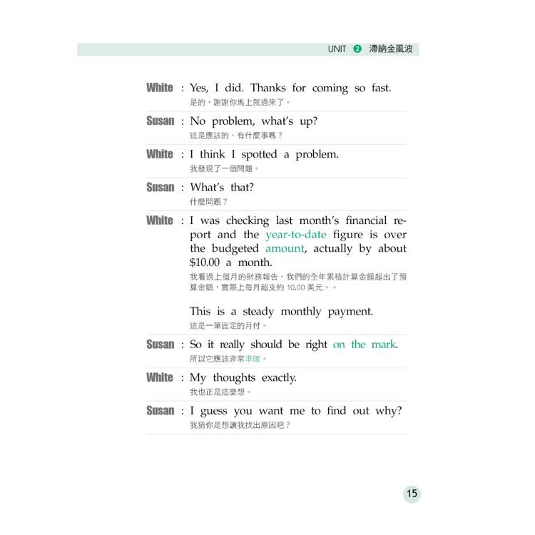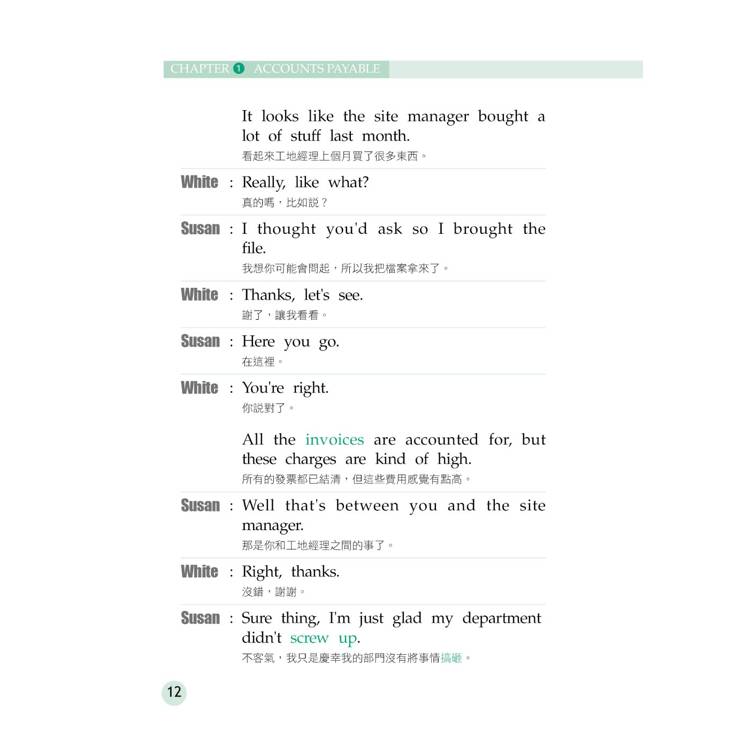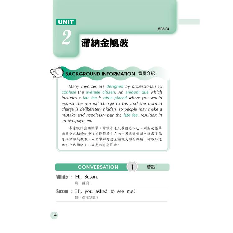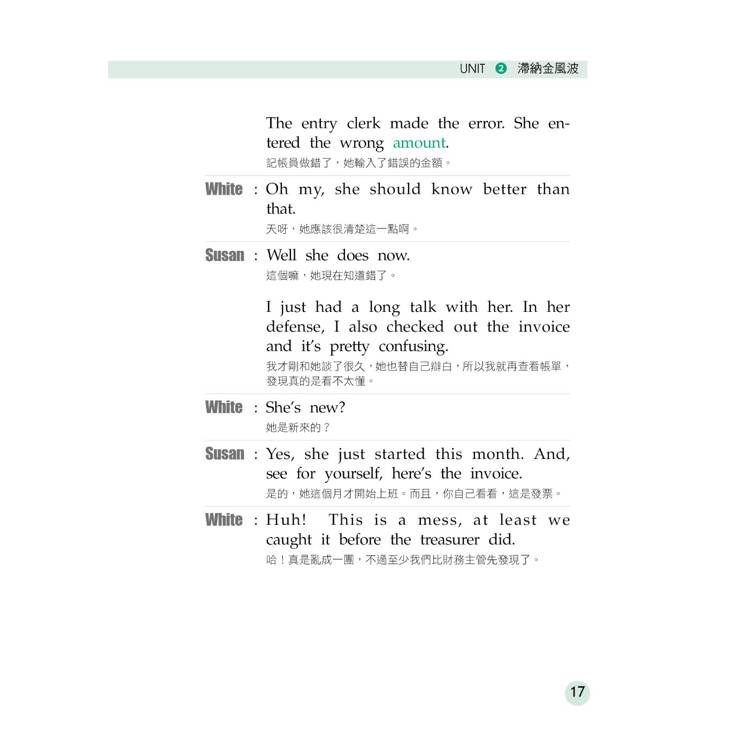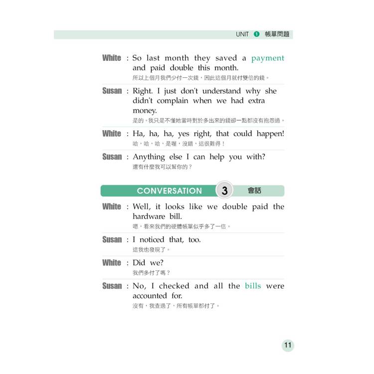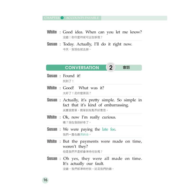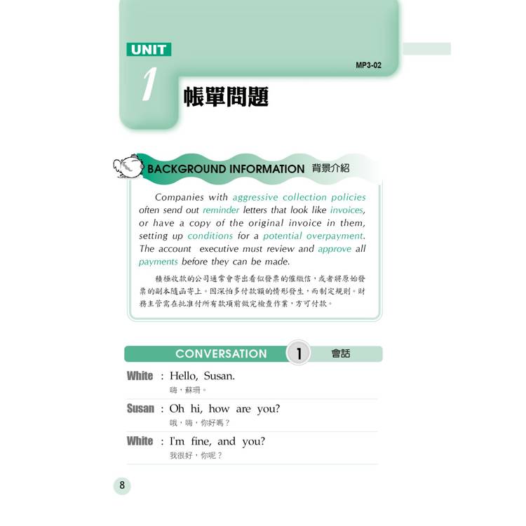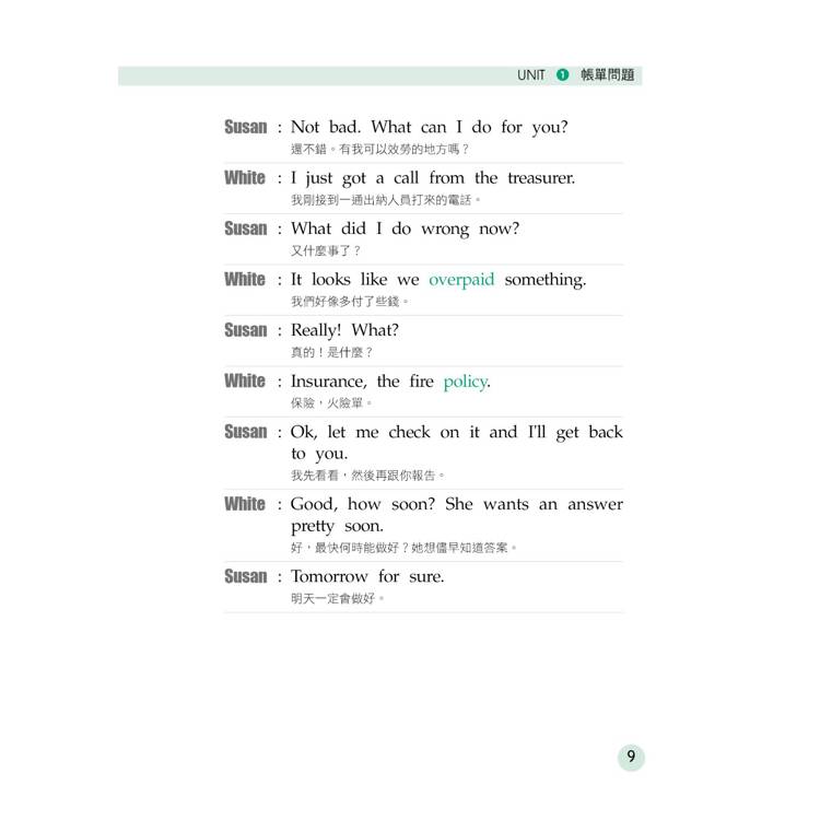 本章將主管與帳務部的相關對話,收錄在十個單元裡。出帳、滯納金、訂金、預付款的相關事宜等應有盡有,實用會計英語盡在這裡。