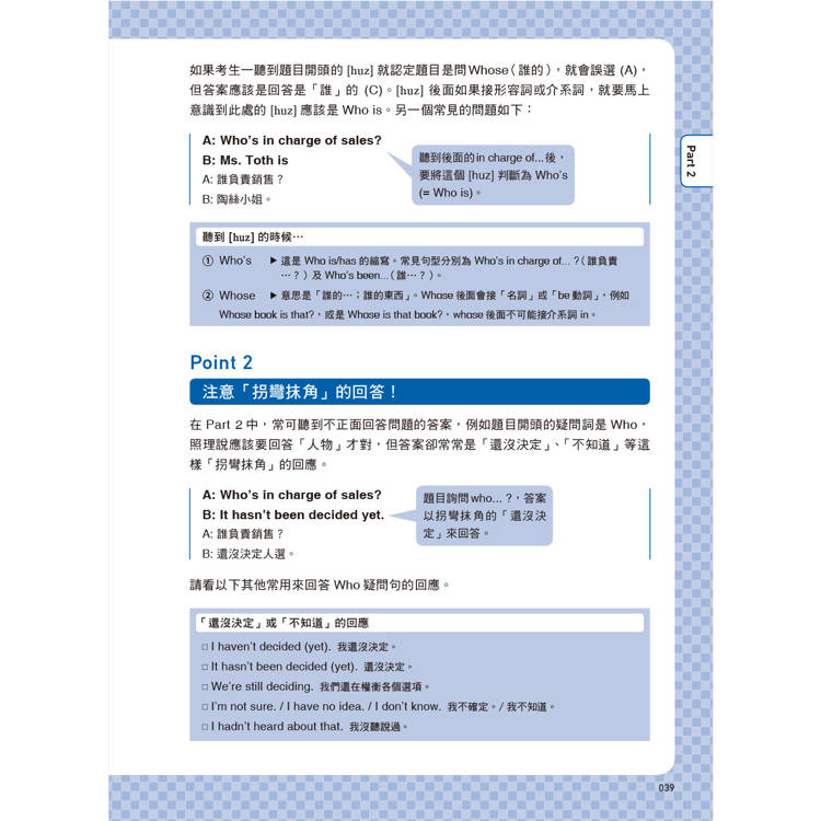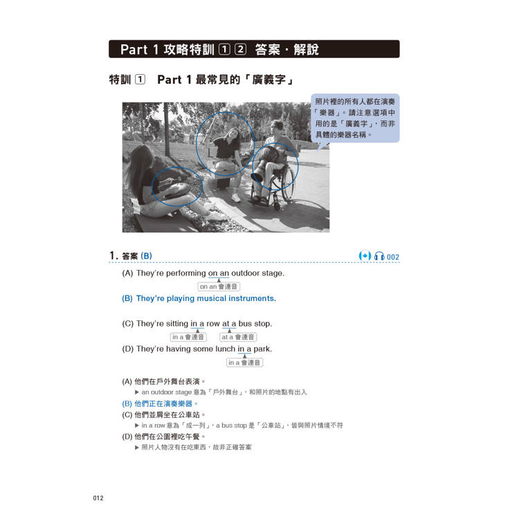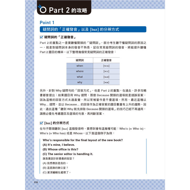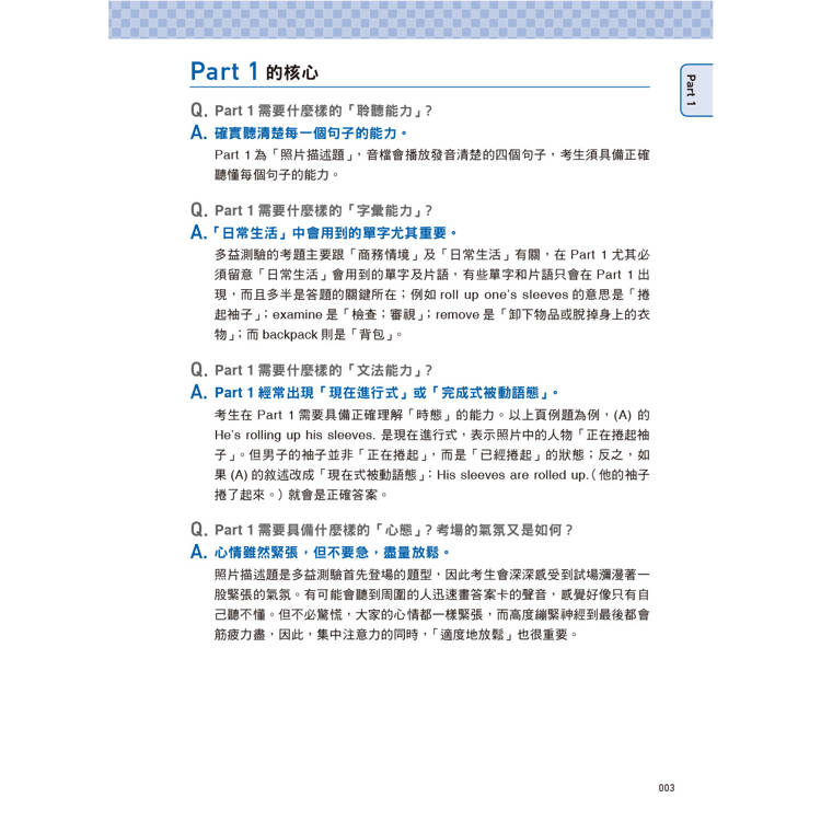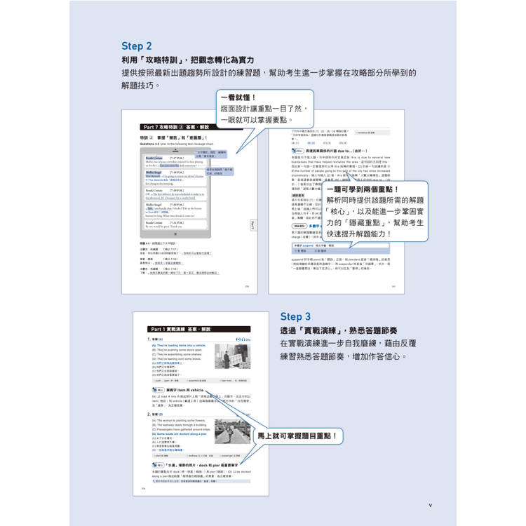 市面上的多益參考書所提供的應試技巧,常會出現「看著照片,預測可能的敘述」、「耐心等待關鍵字出現,聽到關鍵字後就馬上答題」、「文法題先看選項判斷題型,再看空格前後字作答」、「用略讀的方式閱讀長篇文章」等等,這些技巧即便有時可以應用,但對英語程度基礎的考生而言,不見得有相應的英語程度可以應對,結果背了技巧反而經常是適得其反。本書想告訴考生,即便不使用前述這些技巧,也可以考取高分。
