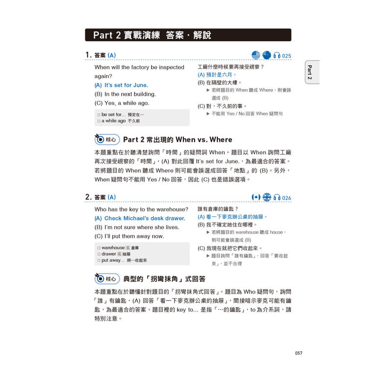 舉例來說,針對Part 5的句子填空題,一般參考書最常見的解題技巧是「先看選項判斷題型,再看空格前後字作答」,但對大部分的考生而言,實際情況是看了空格前後也解不了題,最後還是得從頭再看一次題目,白白浪費了分秒必爭的解題時間。因此本書要幫考生回到最踏實的解題方法,讀懂句子結構,才能快速判斷空格缺少什麼元素,也才能夠真正正確答題。