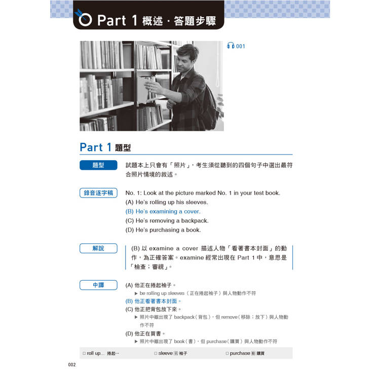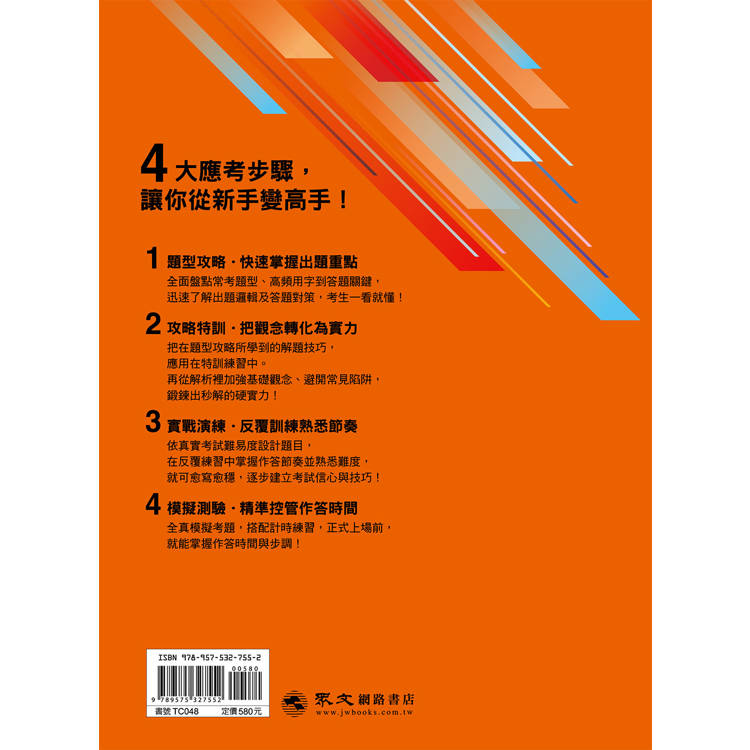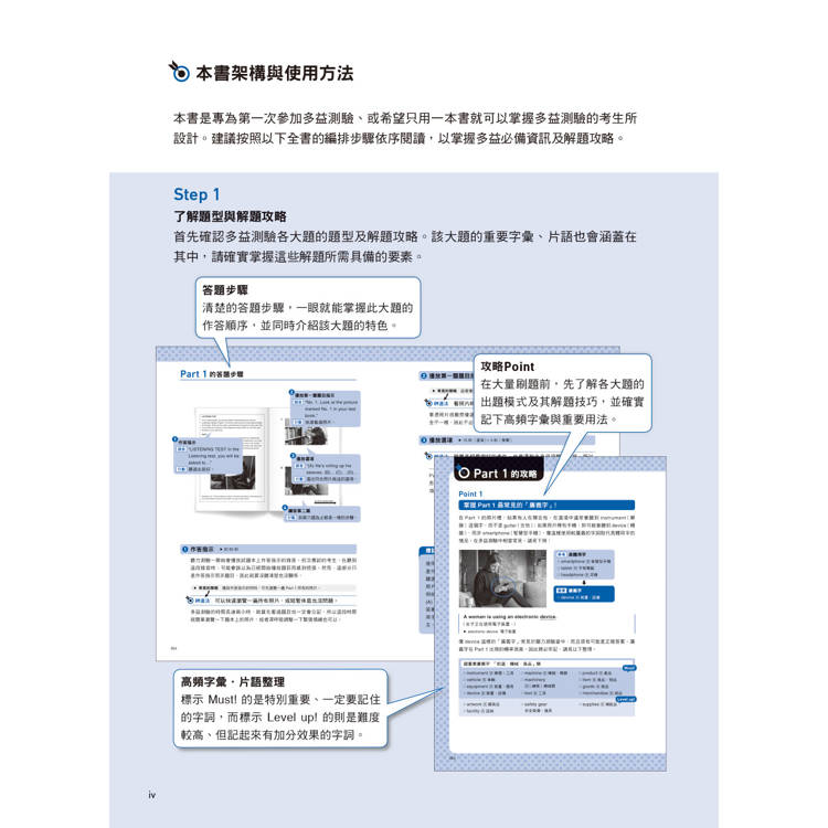 本書依照「由廣到精」的學習邏輯設計,從大範圍建立基礎,逐步聚焦,最終以完整模擬測驗驗收實力。內容涵蓋 Part 1~7,分為「題型攻略 → 攻略特訓 → 實戰演練 → 完整模擬測驗」四大階段:先透過題型攻略掌握各題型重點,再以攻略特訓強化解題技巧,進一步透過實戰演練累積應試能力,最後以一回完整模擬測驗檢視學習成果。搭配詳盡解析,幫助考生清楚掌握優勢與弱點,建立穩定的作答節奏。