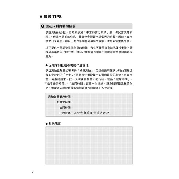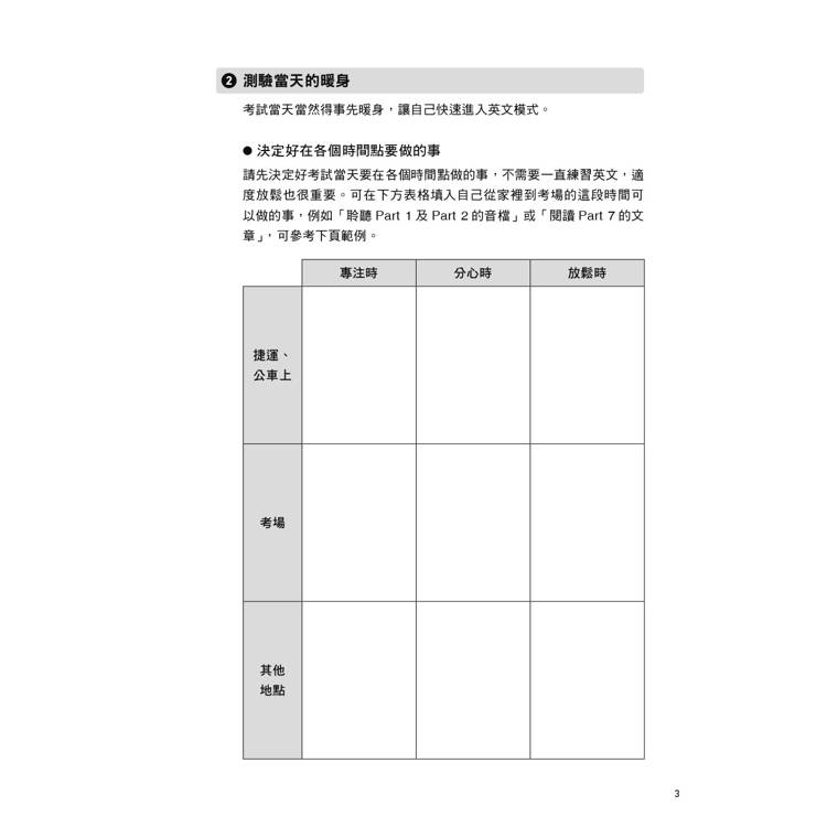 除了攻略、練習題之外,本書額外收錄的別冊還提供了考試當天的熱身技巧,以及考前複習重點整理,幫助我在考試當天保持冷靜!——T考生
