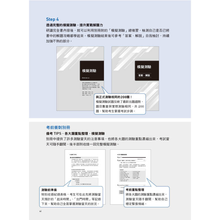 收錄備考 TIPS、各大題重點整理與完整模擬測驗,考前快速翻閱,一次掌握關鍵重點,穩定心態、精準上場,助你順利突破 600 分!