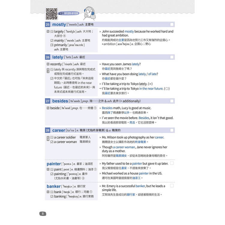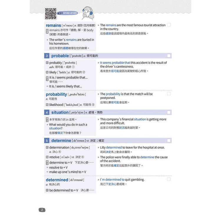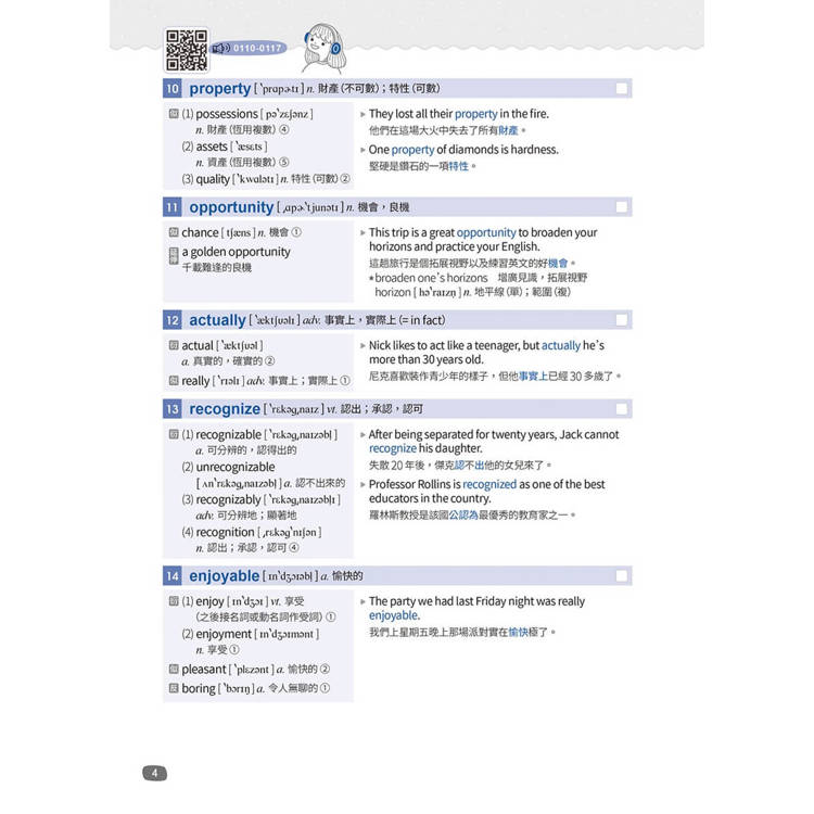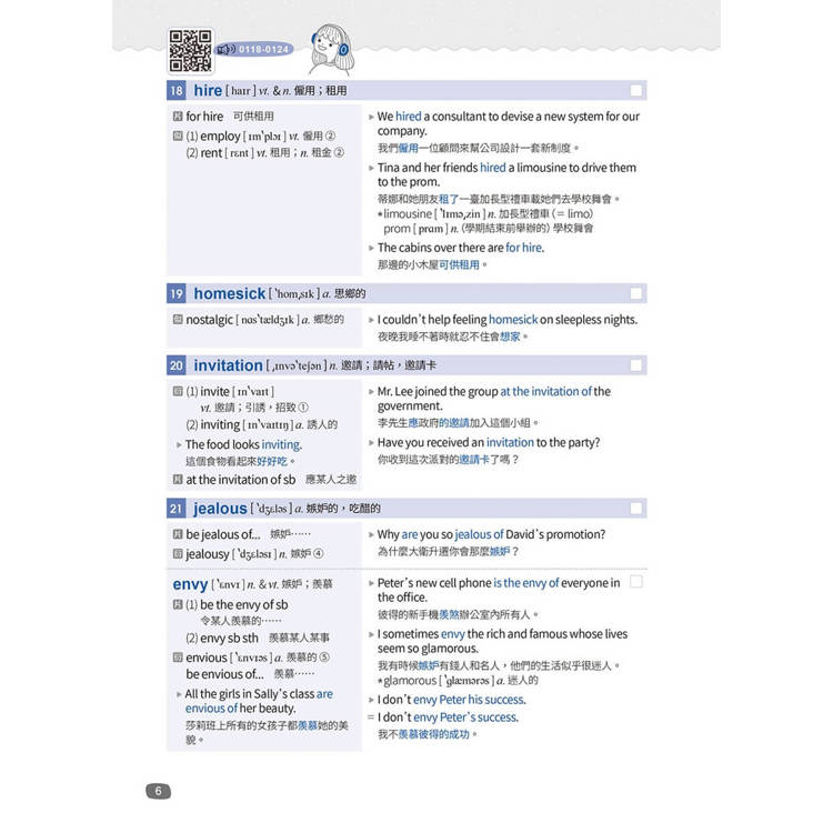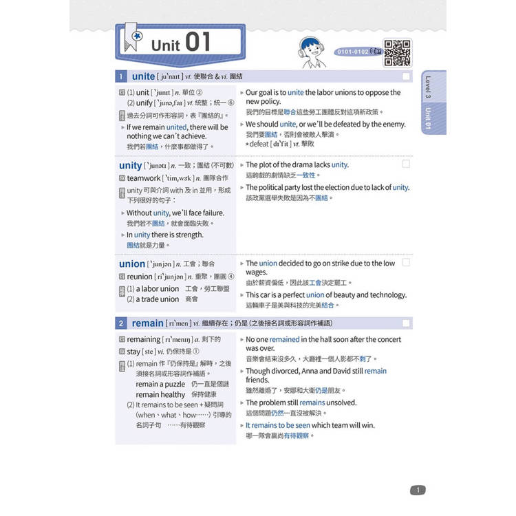 音檔設計上,我們特請專業美籍老師朗讀單字及例句,且為了結合科技、響應環保,全書採用“QR Code”,讀者可依使用習慣,自由選擇聆聽分頁式音檔或一次完整下載音檔,邊聽邊朗讀單字及例句,可大幅改善發音並增進口語能力。
