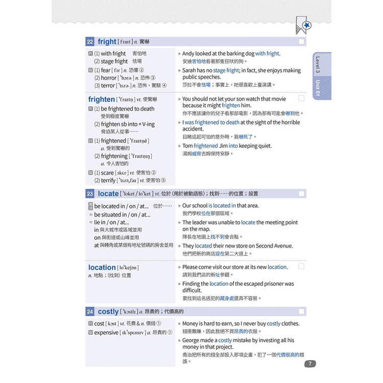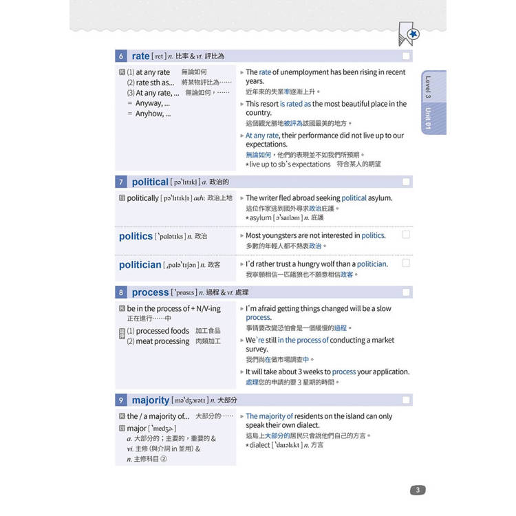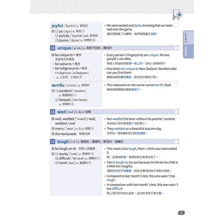 內容方面,每單元單字除提供K.K.音標、詞性、實用例句、中文解釋外,亦嚴選補充該單字重要的片語、衍生字、近似字、反義字、比較用字、延伸用法及文法說明等,讓讀者在日常英語閱讀、聆聽、口說、寫作能力養成上,都能靈活運用這些字詞。