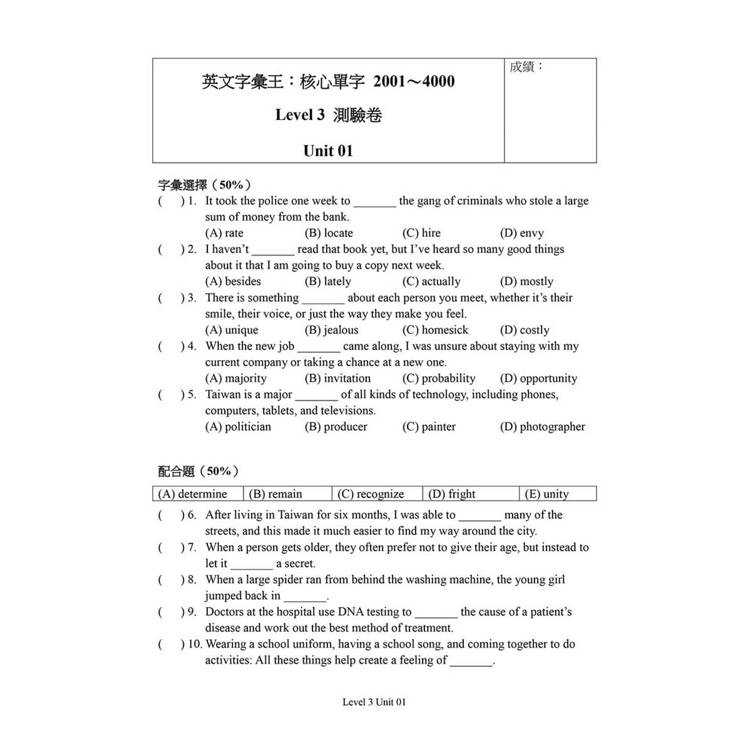 • 單元演練: 每個單元內含10題精準測驗,包含字彙選擇與配合題各5題。