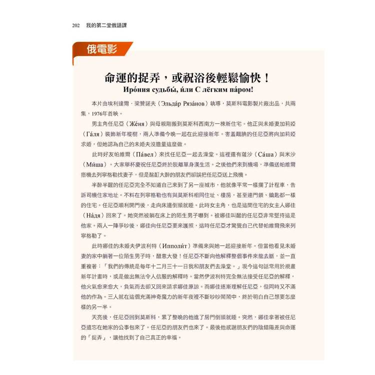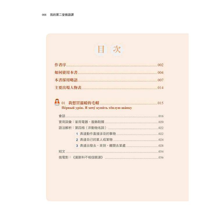 本書延續《我的第一堂俄語課》(以下簡稱《第一堂》)架構與內容,專為學習完《第一堂》,或已具備A1程度,計畫邁入A2的俄語學習者設計。本書總共十課,每課主題皆貼近生活,且將與《第一堂》的主要出場人物再度相遇,一起與他們聊購物、住宅、外表、美食、城市、興趣、文藝、節慶、旅遊、學習等有趣主題。本書每課皆包含「對話」、「對話單詞與句型解析」、「實用詞彙」、「語法解析」,以及「短文閱讀」。請您按照順序學習,並搭配音檔,邊聽邊跟著俄籍老師朗誦對話、對話單詞、實用詞彙與短文。另外,您在每課課名頁的右下角會發現有趣的短句,那些皆取自蘇聯或俄羅斯經典電影。在每課最後的「俄電影」將可找到該短句的出處影片,並瞭解其意義。而這樣的安排,是願您在俄語學習過程中,也能從語言與生活角度認識俄羅斯文化。