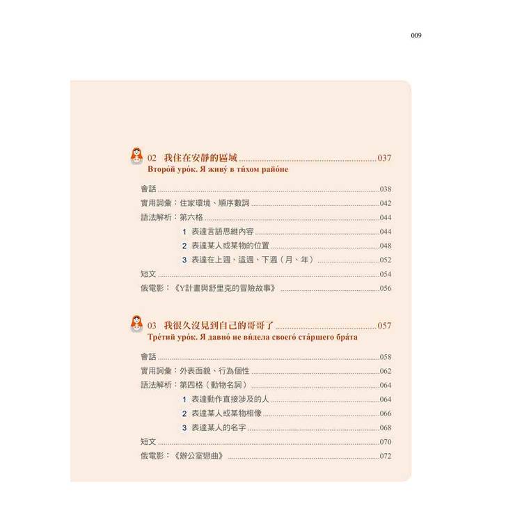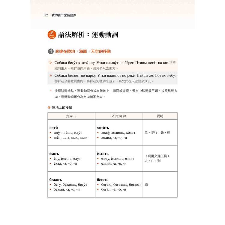 特別要提醒讀者的是,在本書每課的「語法解析」中,第一課至第六課著重在「代詞」、「形容詞」與「名詞」各格單、複數變化;第七課與第八課將學習表達「說明」、「限定」、「時間」、「條件」、「讓步」、「目的」等意義的主從複合句使用方式;第九課為「未帶前綴」與「帶前綴」運動動詞;第十課包含「動詞命令式」、「形容詞與副詞比較級」,以及「直接引語與間接引語」。這些語法規則比《第一堂》所學的語法更具難度與挑戰性,但別擔心,只要細讀規則,完成小試身手,並參考本書最後所附的解答檢驗所學,如此循序漸進地學習,您將獲得滿滿的成就感,並能達到俄語A2程度。