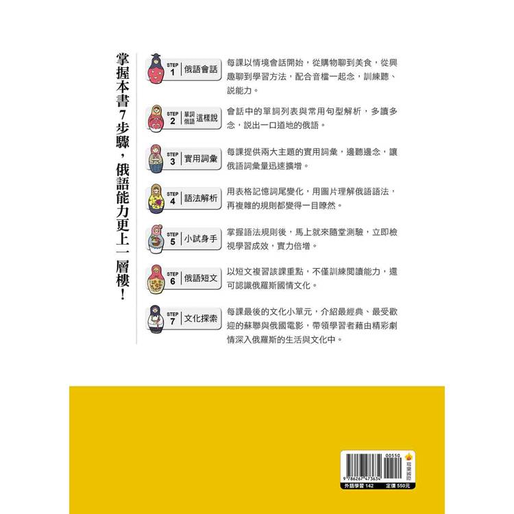 本書10課中,每課又細分7個STEP,讓您循序漸進,學習俄語的每一步都踩得踏實又穩固。