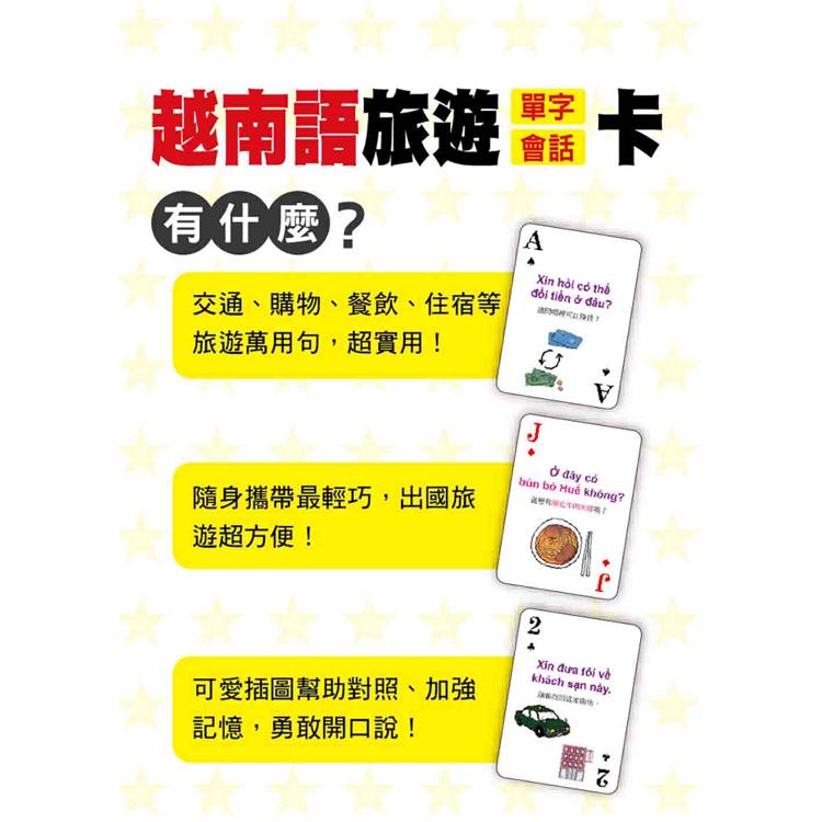 打開撲克牌玩一玩!每張撲克牌都有越南語、中文解釋,加上音檔輔助學習,只要跟著讀、照著唸,越南語一點都不難!