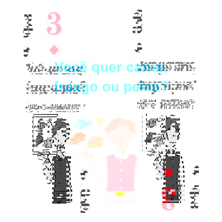 打開撲克牌玩一玩!每張撲克牌都有葡萄牙語短句、中文翻譯,加上音檔輔助,更能帶入互動教學,大人小孩一起玩,葡萄牙語一點都不難!