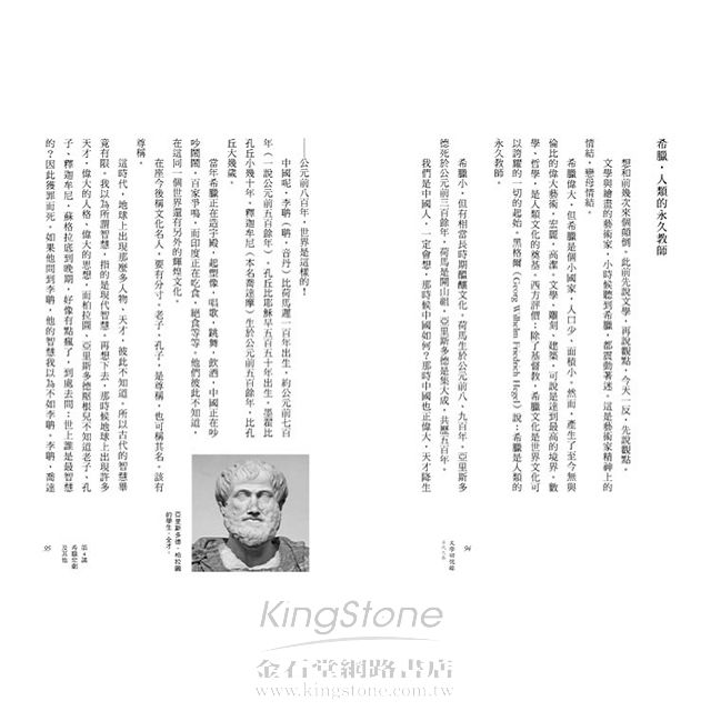 涵蓋希臘羅馬神話、希臘史詩、希臘悲劇、《聖經》、釋迦牟尼、印度史詩、《詩經》、《楚辭》、中國古代歷史學家、先秦諸子(老子、孔子、墨子、孟子、莊子、荀子、韓菲子)、魏晉文學到五世紀初的陶淵明。