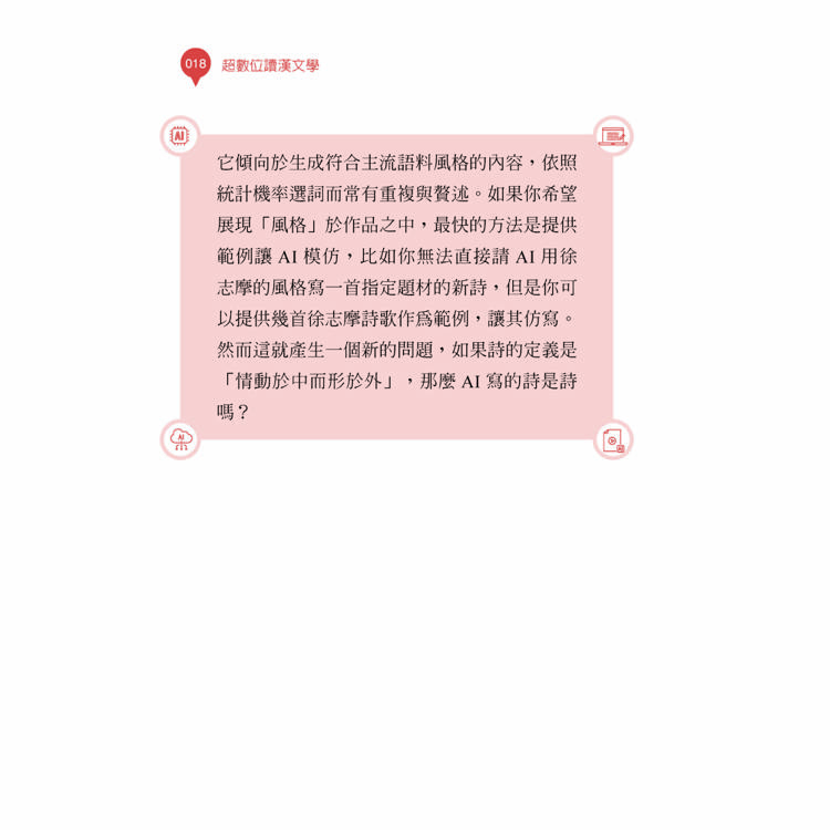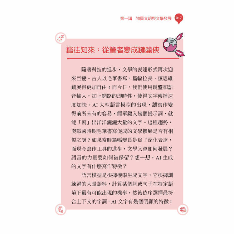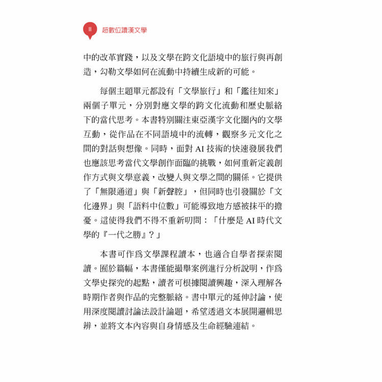 每個主題單元都設有「文學旅行」和「鑑往知來」兩個子單元,分別對應文學的跨文化流動和歷史脈絡下的當代思考。本書特別關注東亞漢字文化圈內的文學互動,從作品在不同語境中的流轉,觀察多元文化之間的對話與想像。同時,面對AI 技術的快速發展我們也應該思考當代文學創作面臨的挑戰,如何重新定義創作方式與文學意義,改變人與文學之間的關係。它提供了「無限通道」與「新聲腔」,但同時也引發關於「文化邊界」與「語料中位數」可能導致地方感被抹平的擔憂。這使得我們不得不重新叨問:「什麼是AI 時代文學的『一代之勝』?」