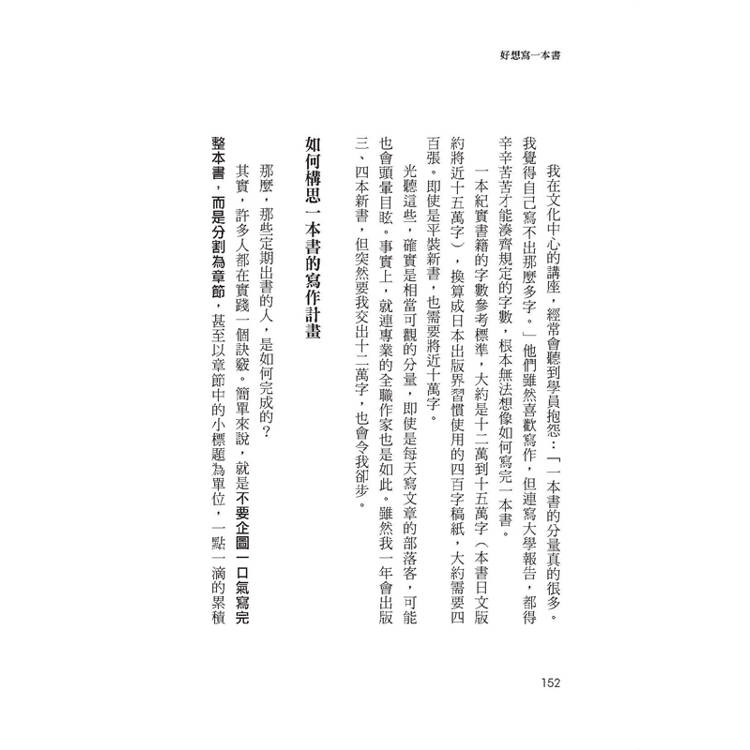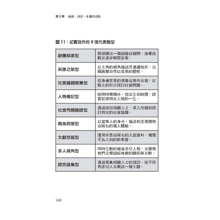 如何構思一本書的寫作計畫/職業作家怎麼寫書?拆解給你看/設定大故事的基本結構/小故事的刪減與整理/紀實作品的九大主要架構/設定寫作的風格類型──從虛構取經/保留粗糙的質感,會更真實/駕馭多采多姿的表現形式/不被時間軸束縛/各章節巧妙嵌入不同視角/多視角法,讓故事更有吸引力